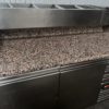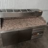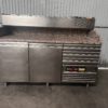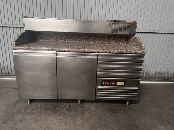 Mueble bajo mostrador con sobre de granito y 2 puertas refrigeradas y 3 cajones neutros, con vitrina refrigerada para ingredientes, en acero inoxidable, marca Eureofred.
