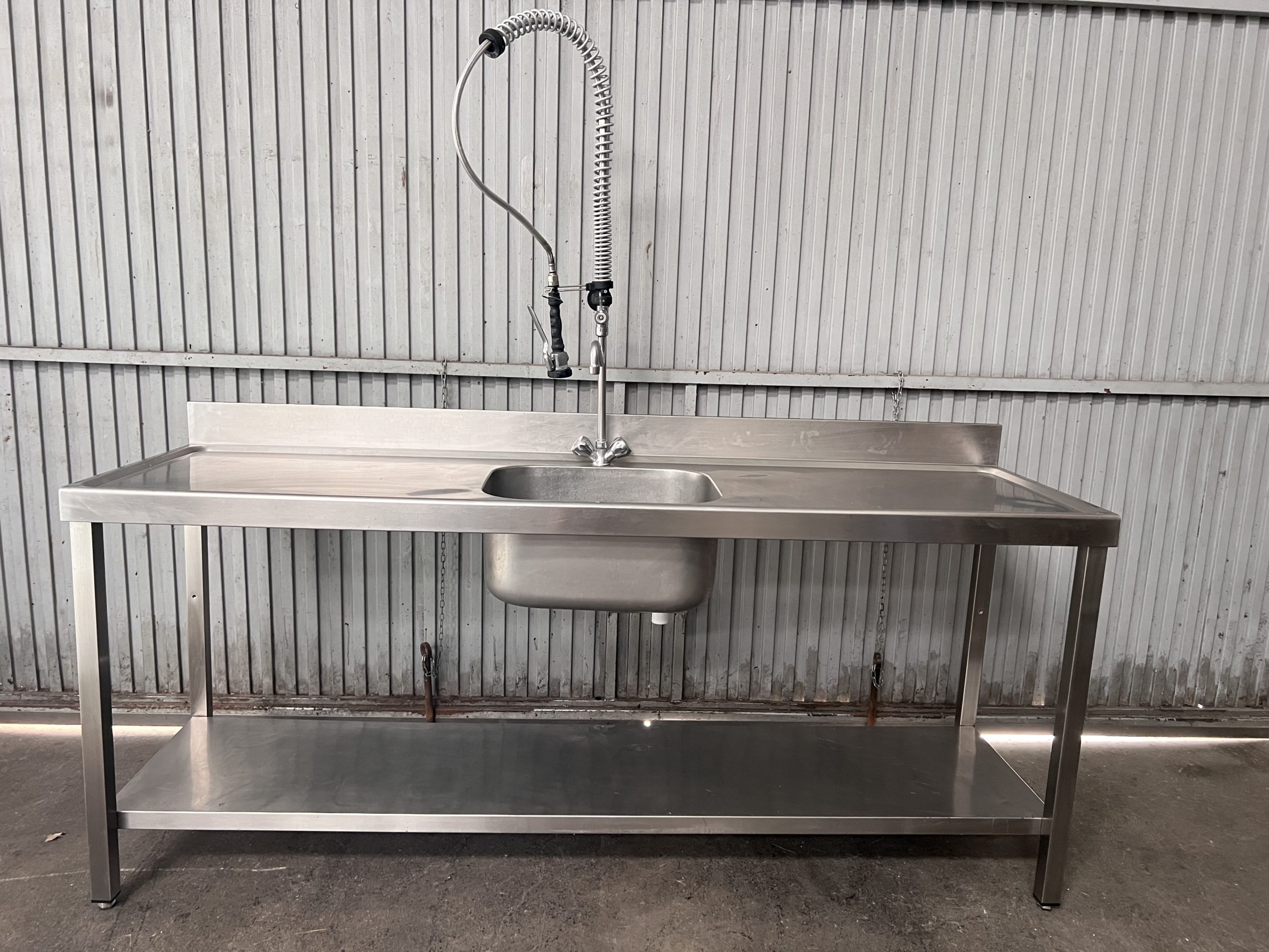 Fregadero de 1 seno con grifo ducha y 1 estante inferior, de la marca Distform, en acero inoxidable.
