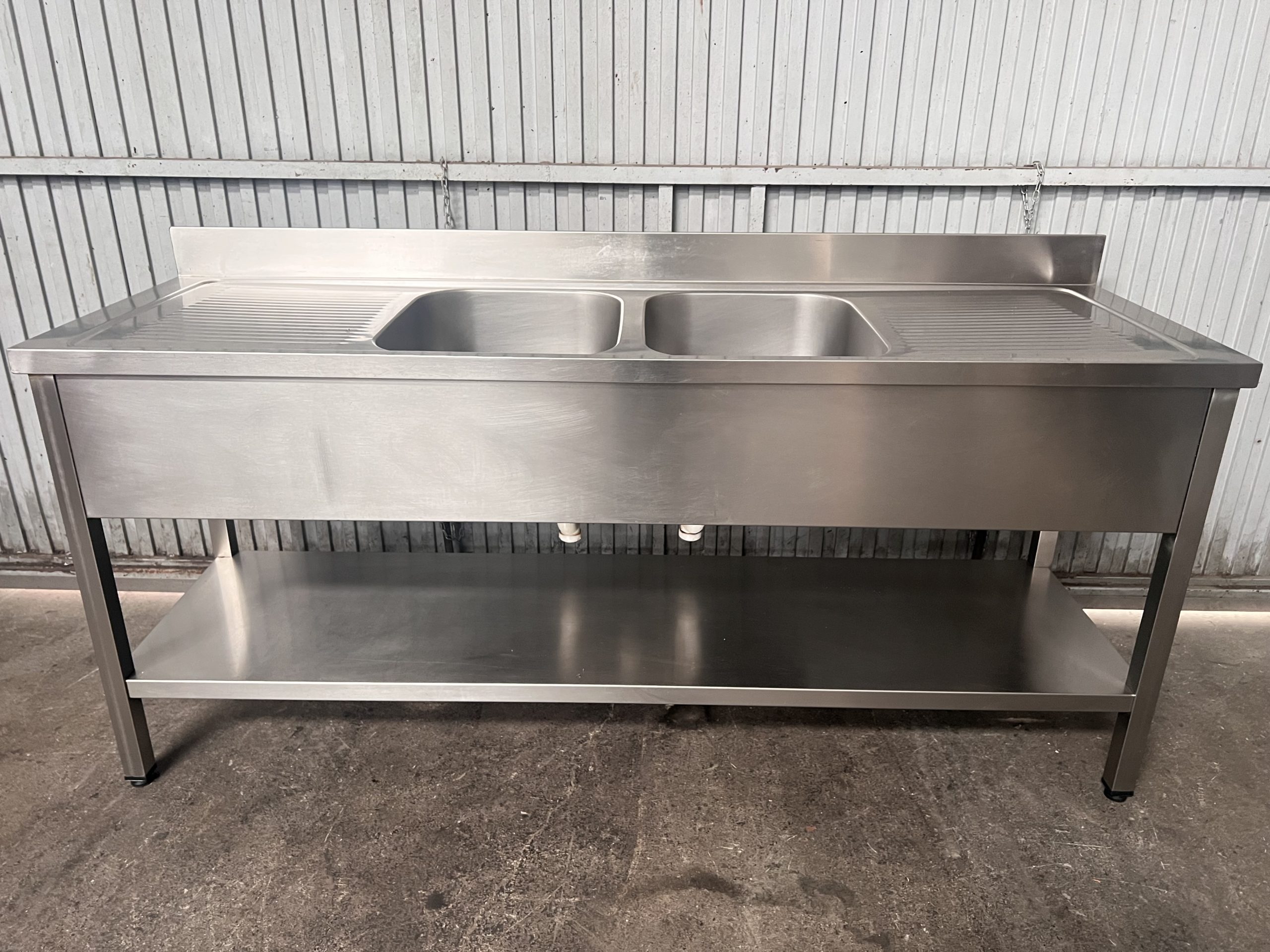 Fregadero de 2 senos, escurridor y 1 estante inferior, en acero inoxidable.