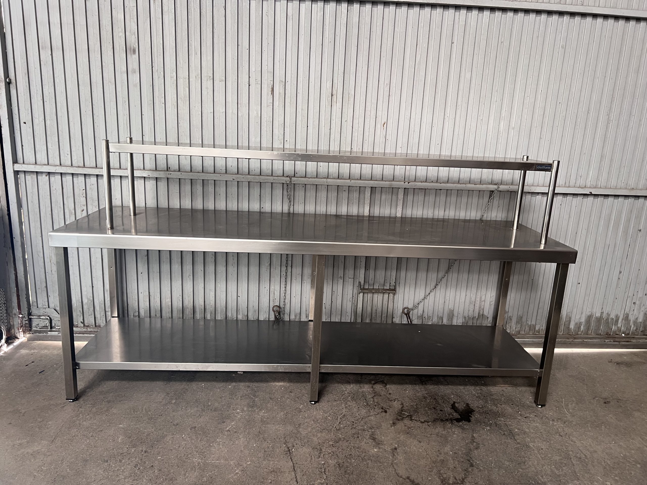 Mesa central de trabajo con 1 estante y pasaplatos inox 2,4 mts.