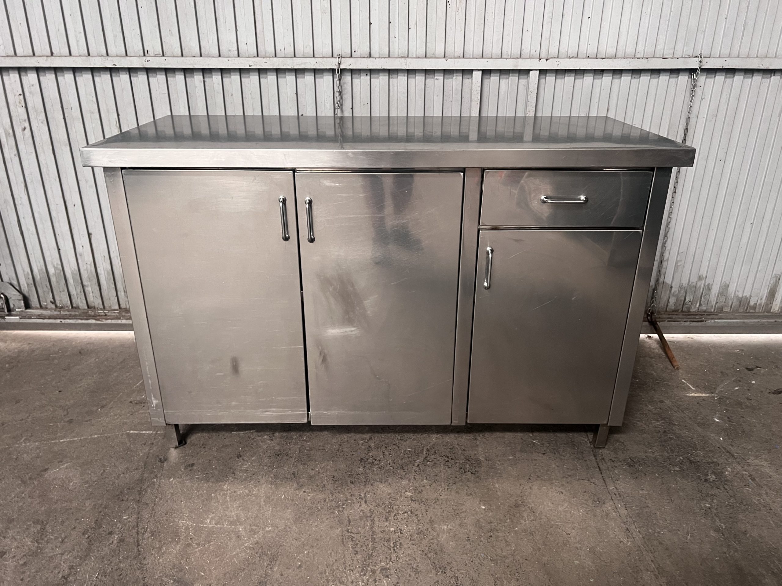 Mesa con 3 puertas, 1 cajón y 1 estante interior, en acero inoxidable.