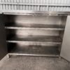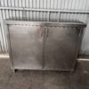 Mesa mueble con puertas abatibles y varios estantes interiores, en acero inoxidable.
