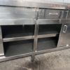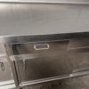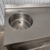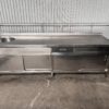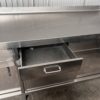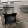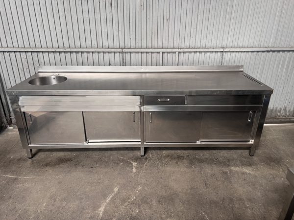Mesa mural de trabajo con 1 seno/fregadero, soporte/ranura para cuchillos de trabajo, 1 cajón, estante interior y puertas correderas, todo en acero inoxidable.
