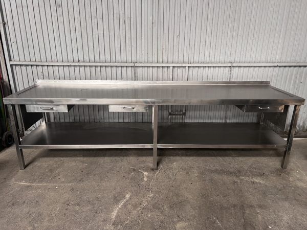 Mesa mural de trabajo con 1 estante inferior, 3 cajones y 2 soportes/ranuras 1 en cada lado para poner cuchillos de trabajo, todo en acero inoxidable.